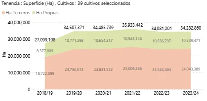 Argentina, país de los alimentos. Con una superficie de 2.780.085 km² en continente americano, tiene hoy 34.282.860 hectáreas de su superficie copada de cultivos.